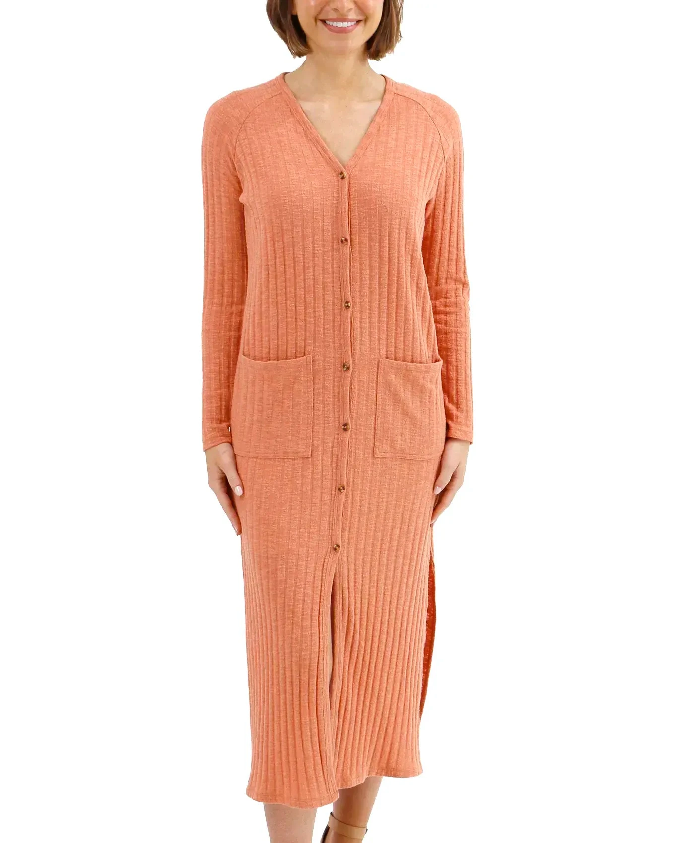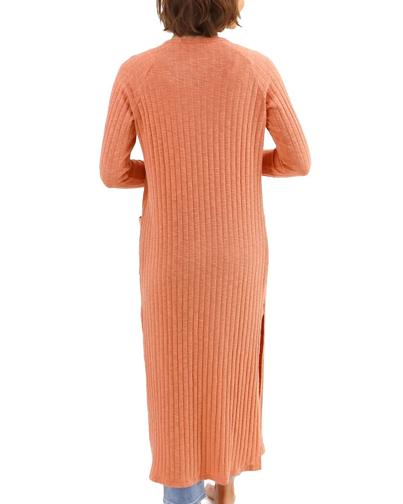- Ribbed knit, long duster cardigan in sunset orange with side slits for comfortable movement