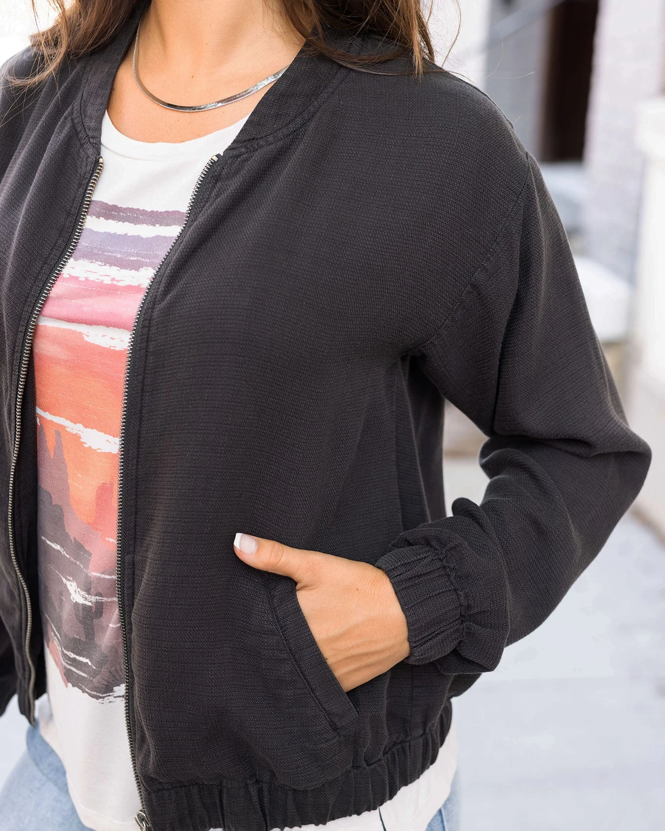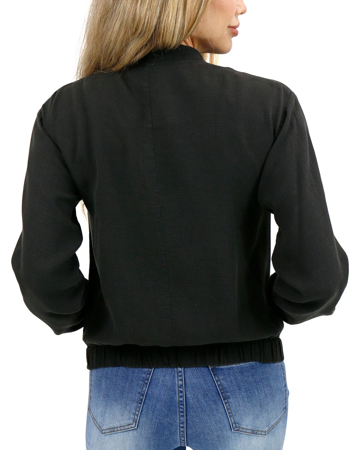 Tencel™ baseball styled jacket. Functional size pockets and front zipper closure. Stretch elastic at the bottom hem. Textured crosshatch woven fabric has no stretch. True to size fit. Stay in your normal size. If between sizes, size up if you are wanting to layer this or size down if you are not intending as a layering piece.