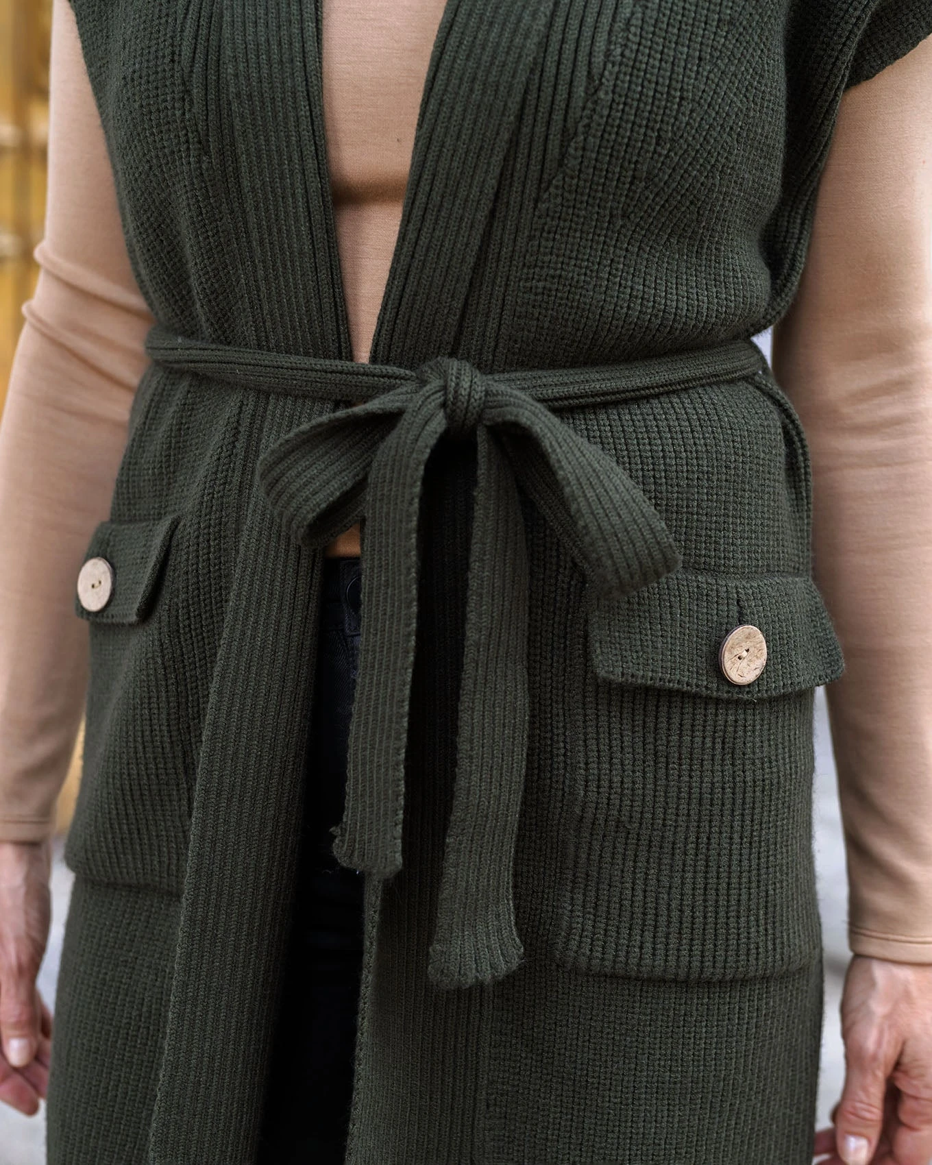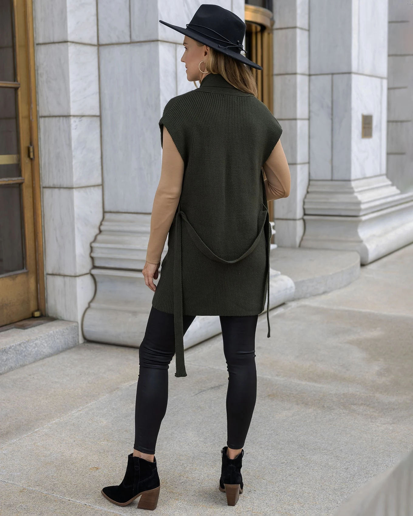 The elevated sleeveless sweater that is a seasonal must have! Our Winter Knit Long Sweater Vest is your cool weather wardrobe staple with it’s high-end soft ribbed knit with statement pockets and belted tie. This sleeveless long sweater vest makes a simple style statement layered over long sleeve tops and dresses!